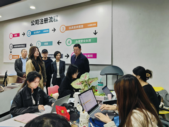 金杨华一行深入顾家木艺抖音直播间,观摩学生实战运营,与校企导师、在岗学生深入交流。金杨华高度肯定该项目依托“新双高” 建设中形成的“校企同步、学做合一” 育人模式,强调产教融合是职业教育培养产业急需型人才的关键路径。